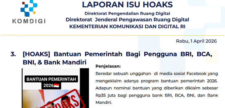 Read More“[HOAKS] Bantuan Pemerintah Bagi Pengguna BRI, BCA, BNI, & Bank Mandiri”